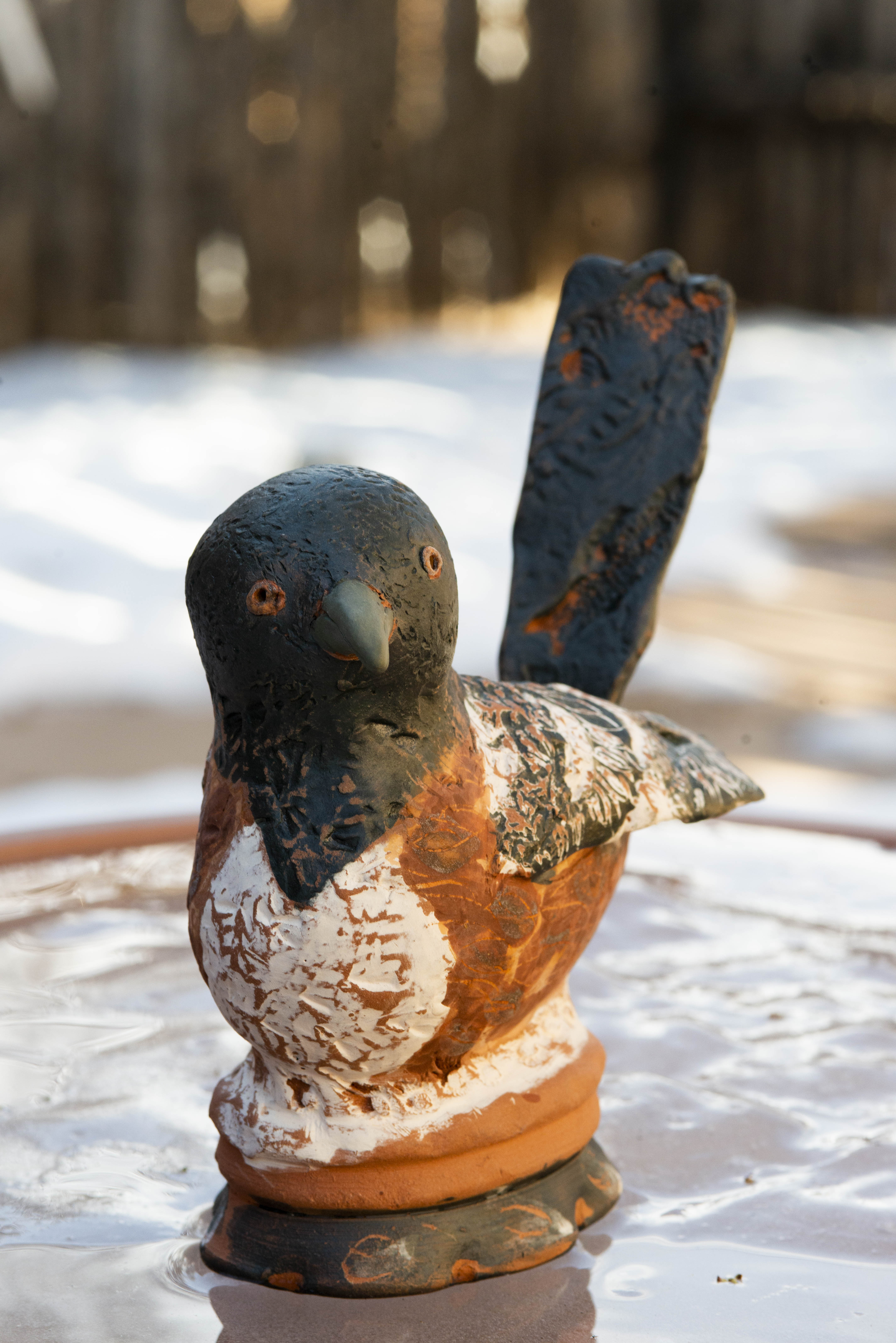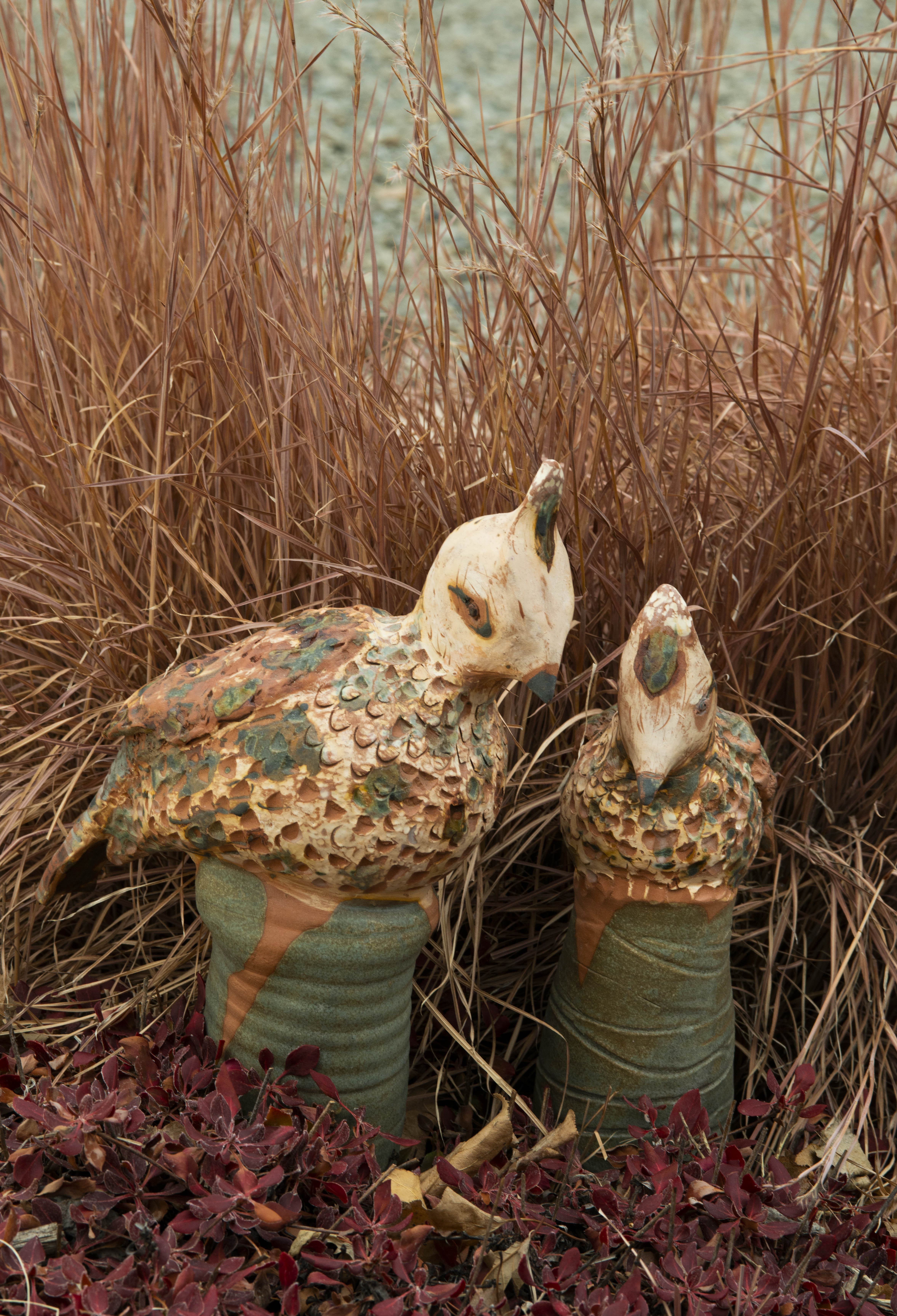 The body, head, skirt and beret are thrown on the potter’s wheel and then paddled and altered. Gesture, gaze and character are considered in assembly. Textures are a vital piece where I weave nature (corn cobs, seed pods, star anise etc.) onto slab-built wings and tail. Props such as the beret bring the spirit of Irene and her love of France to the bird with a human dimension.