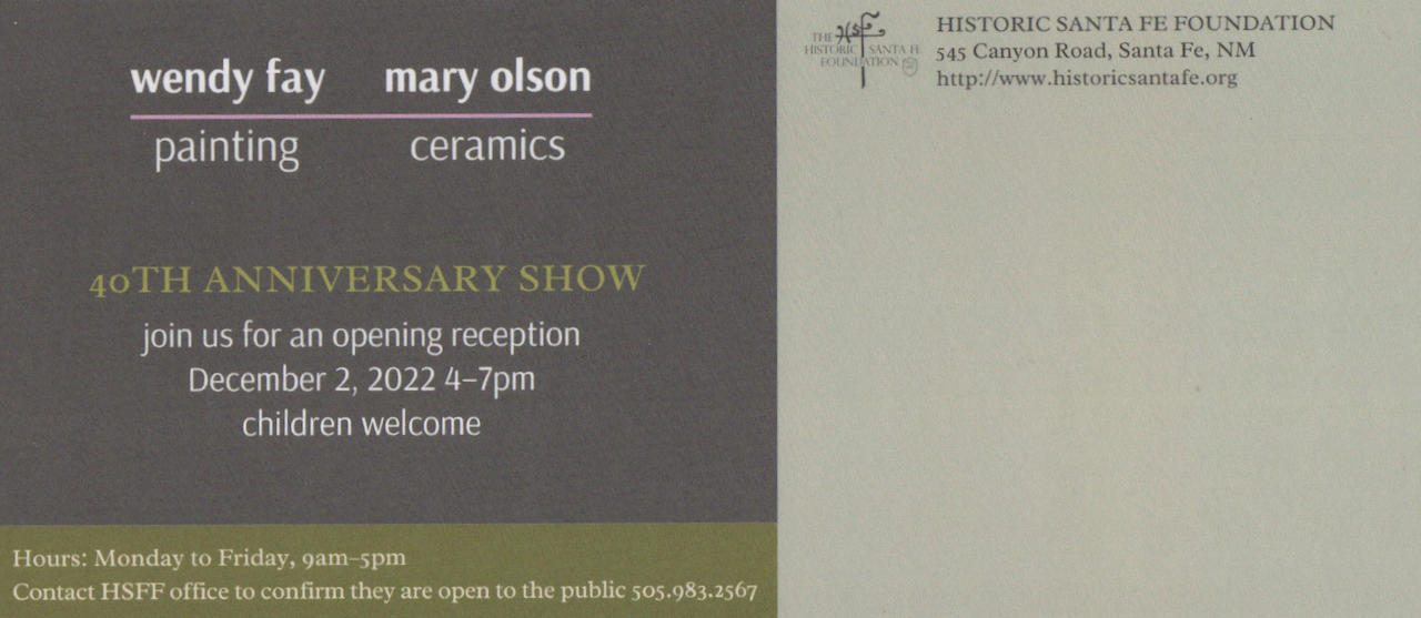 Mary’s show, along with Wendy Fay, Julia Tate Dickenson and Liza Doyle, opens at Historic Santa Fe Foundation’s El Zaguán Gallery April 25, 5:00-7:00.