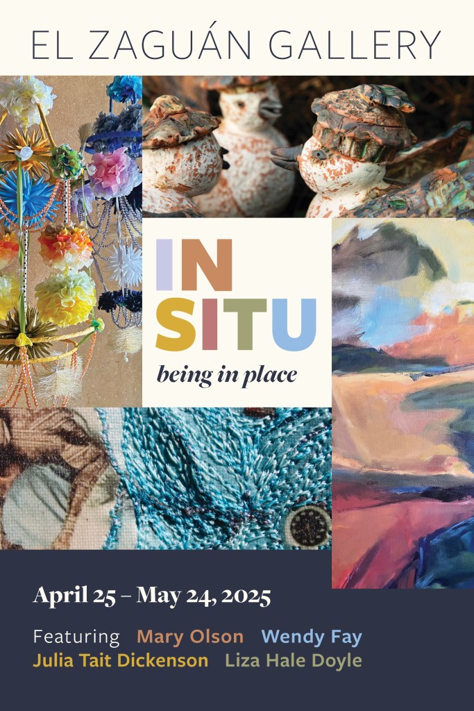 Many of us have an understanding of what grounds us here in Northern New Mexico. The El Zaguán gallery resonates with a sense of home. Our exhibit , “In Situ” – being in place, is an invitation and dialogue amongst ourselves and the viewer to deepen our understanding of location. Our collective work references being at home in place – in society, amongst friends, at El Zaguán, in this landscape, our studios or in our families. What makes you feel this way?
